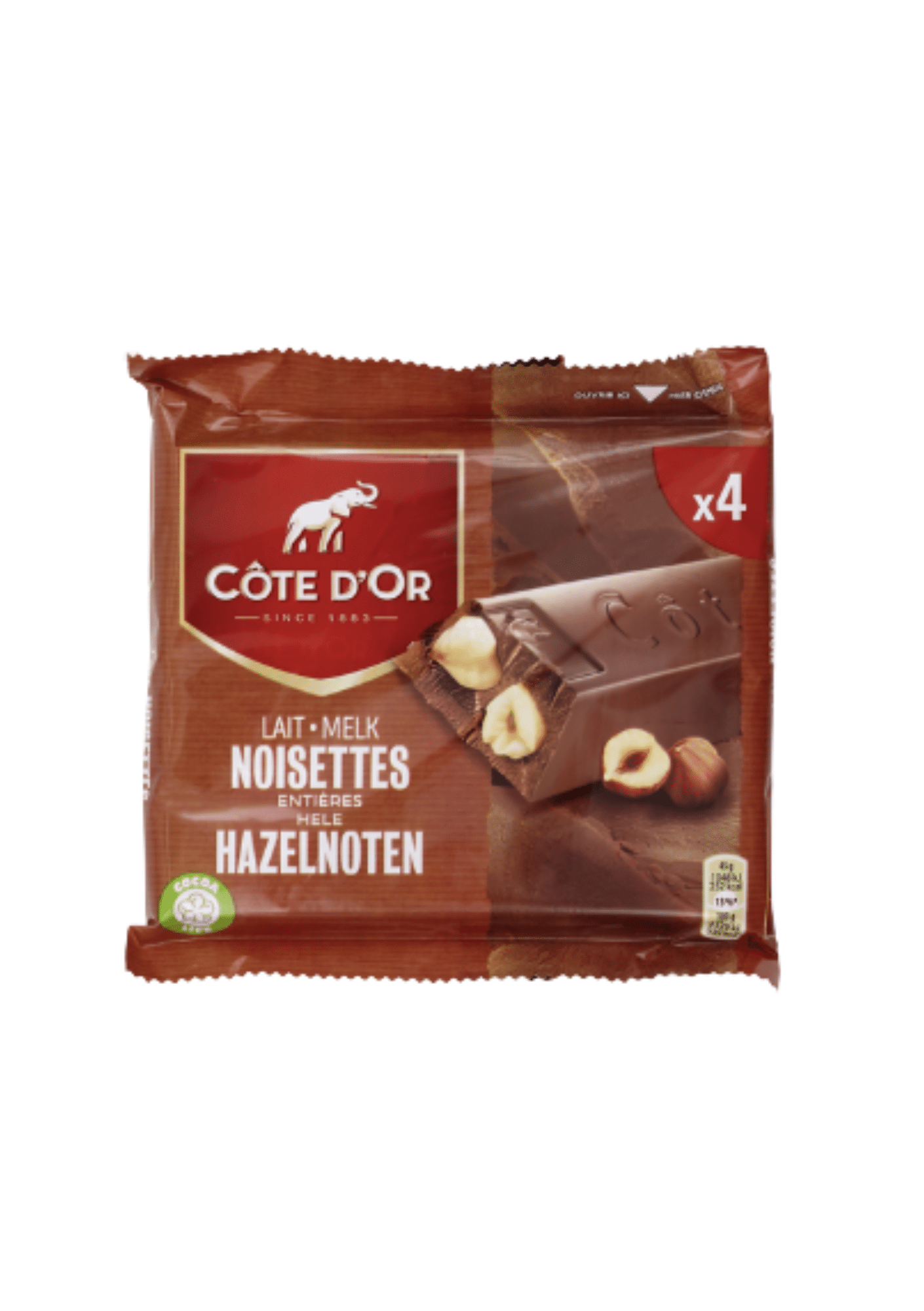 Un bâton généreux de chocolat au lait Côte d’Or, garni de délicieuses noisettes entières pour une expérience croquante et fondante.