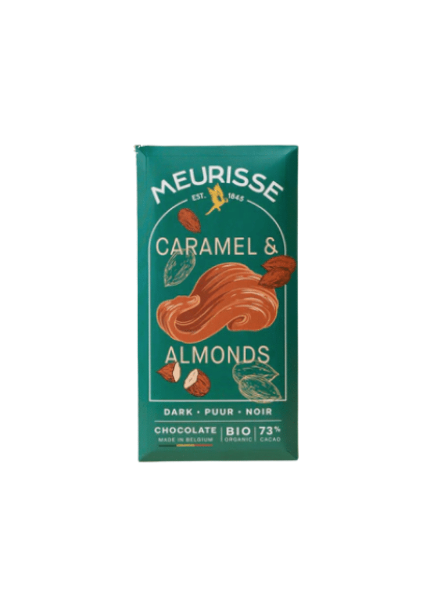 Découvrez l’artisanat chocolatier de Meurisse, maison belge fondée en 1845, avec cette tablette de chocolat noir intense, enrichie de caramel fondant et de pépites d’amandes croquantes.